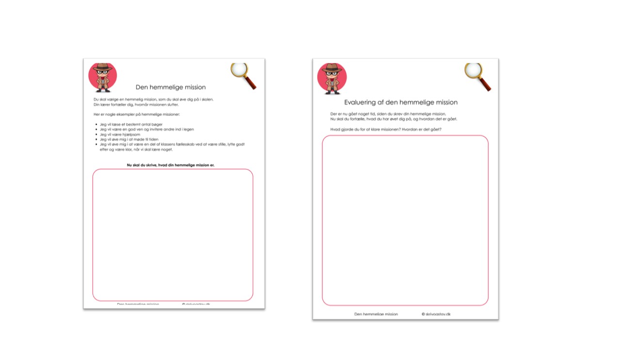Eleverne formulerer deres egen hemmelige mission med udgangspunkt i noget, de gerne vil øve sig på – fagligt, socialt eller personligt. Missionen gemmes og tages frem igen efter en aftalt periode, hvor eleverne evaluerer, hvordan det er gået.