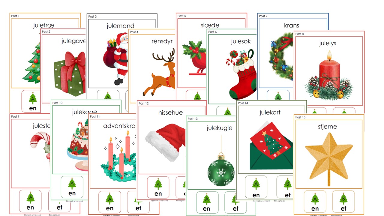 Stjerneløb med jul og navneord. I stjerneløbet indgår 15 poster med julebilleder, hvor eleverne skal sætte en eller et foran.
